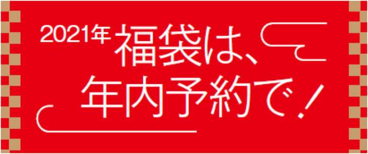 年内中配送の福袋は、12月20日10時までに注文すると、年内に配送で届ける。年内受注、年明け配送の福袋は、10月28日10時~12月25日10時までに注文すると、2021年1月2日以降に配送で届ける。