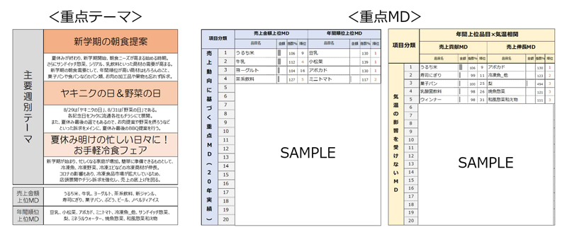 各週の歳時・生活行動、気象傾向、社会行事といった環境与件とPOSデータを分析し、52週ごとに重点的に取り組むべきテーマ・MDを掲載している。客観的データに基づいた重点テーマ・MDにより、月・週・日々の販売効率をより高めることを目指す。
