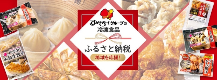 返礼品として、ガストからは「ジューシ―から揚げ(270g)」、バーミヤンからは「冷凍生餃子(目安40個)、本格小籠包(8個)、本格焼売(8個)」、から好しからは「ももから揚げ(575g)から揚げ粉(100g)付」を登録する。