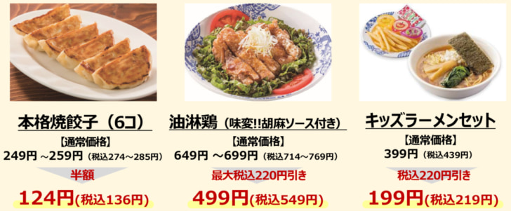 バーミヤンでは、クーポン利用で、人気NO.1メニューの「本格焼餃子(6コ)」(274円~)が半額(136円)、「油淋鶏(味変!!胡麻ソース付き)」(714円~)が549円、「キッズラーメンセット」(439円)が219円になる。
