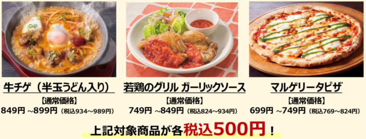 ガストでは、クーポンを利用すると、人気メニュー3品をワンコインで提供。「牛チゲ(半玉うどん入り)」(通常価格:税込934円~)、「若鶏のグリル ガーリックソース」(824円~)、「マルゲリータピザ」(769円~)がいずれも500円となる。