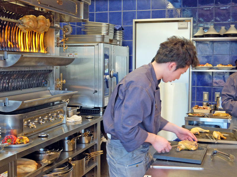 オープンキッチン内にロティサリーマシーンを配置し、注文を受けてから1羽あたり約45分をかけて鶏を焼き上げる。