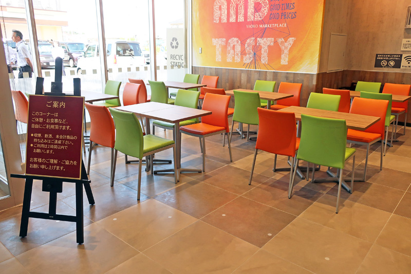購入商品を食べることができる「キッチンカフェ」には座席を配置するほか、無料の給水給茶機を設けた。有料のコーヒー販売機も設置することで、買い物ついでのゆったりとした時間を提供する。