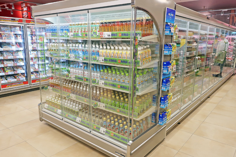 ヤオコーでは初めての取り組みとして、ペットボトル飲料を扉付きのリーチインクーラーに陳列した。