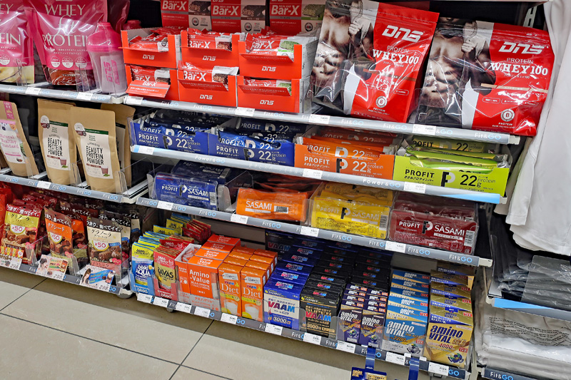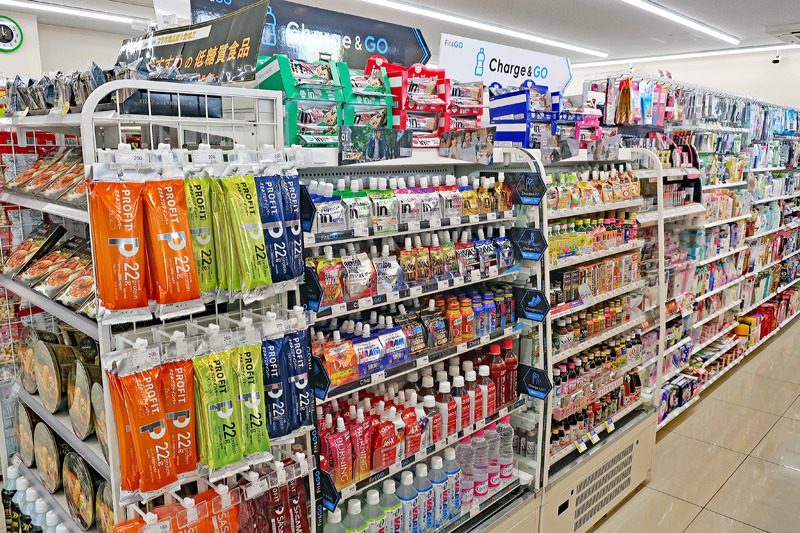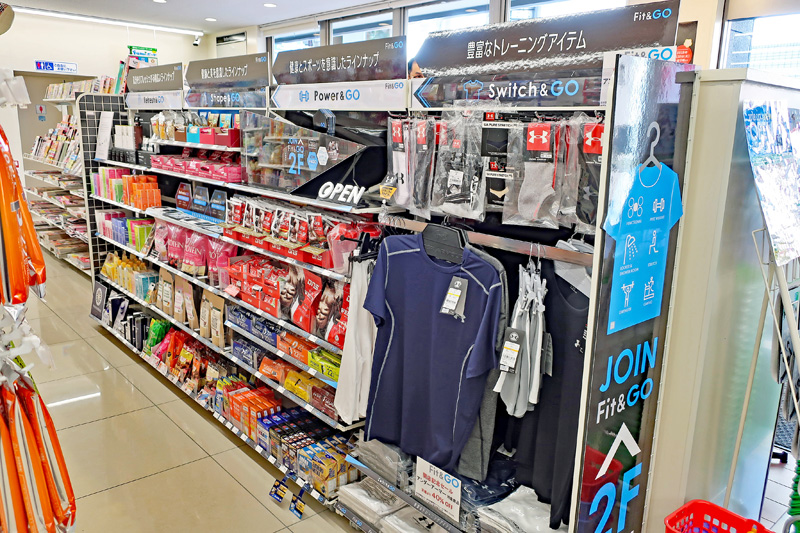 ファミリーマート店内には、Fit&GO専用コーナーを設置した。トレーニングウエア、プロテイン、スキンケア用品など通常のファミリーマートでは扱いのない約180アイテムを集積した。