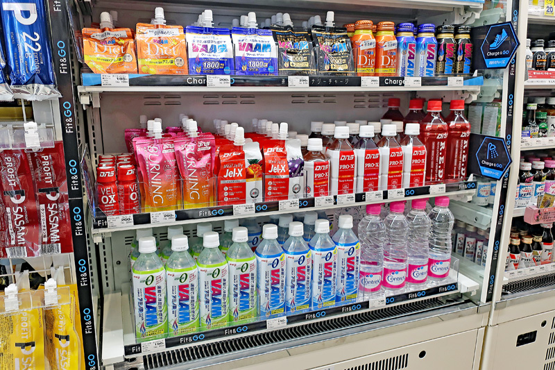 冷蔵ケースでは、運動前にすぐに体に吸収されやすい商品を中心に集めた。