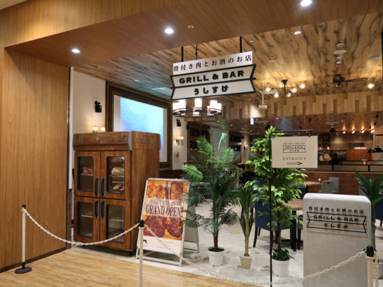 1階には、犬と食事ができる「GRILL&BAR うしすけ」が出店する。焼肉レストラン「うしすけ」などを手掛けるアップストリームの新業態で、約150m2の広々とした店内は、犬を乗せたカートが通れる動線を確保した。リード・フックも36か所用意している。