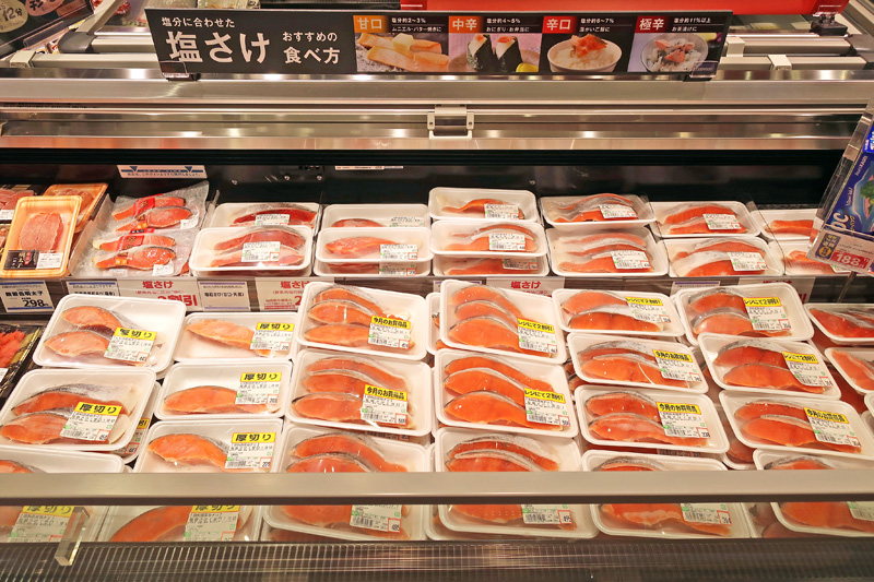 鮮魚部門でも食べ方提案をしており、塩鮭では味わい別の代表メニューを写真付きPOPで紹介する。