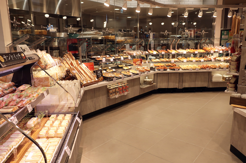 ベーカリー売場は、惣菜売場の次の最終コーナーに配置し、売場から作業場内が見えるようにすることでシズル感・ライブ感を演出する。好評の窯焼きピッツァ、店内製造のサンドイッチ、調理パン、スイートドーナッツを充実させ、最大の品ぞろえとした。