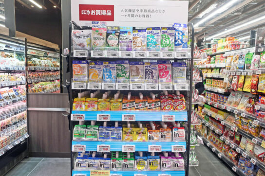 グロサリー売場では、オフィスの勤務者に対応し、「機能性飲料」「サプリメント」などをまとめて展開する。売場スペースに限りがあるものの、パック米飯は1個バラを充実させ、カップ麺もミニカップの売場を確保する。