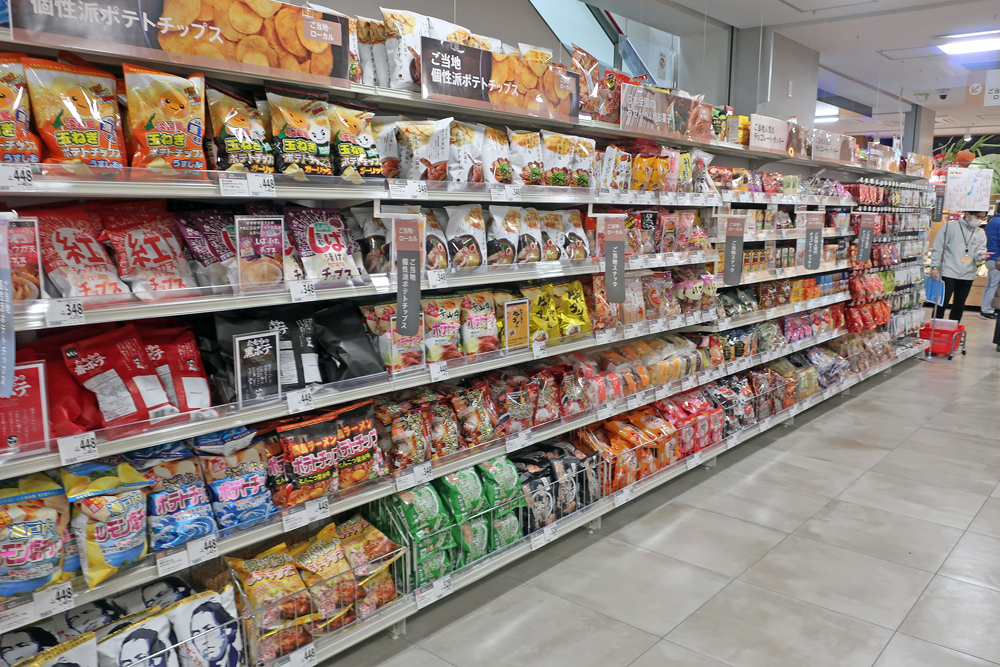 お菓子では、「土佐の塩ポテトチップス」など全国からインパクトのあるポテトチップスを厳選して取り揃えるほか、「北海道バタークッキー」など、お土産品として販売されているチョコ、クッキーを集積展開するなど、全国のお菓子を充実させた。海外のお菓子も充実させ、ベルギーやスイスのチョコレートなどヨーロッパの菓子を中心に展開する。また、素材にこだわった体に優しいお菓子や、低糖質、低カロリー菓子も品揃えした。