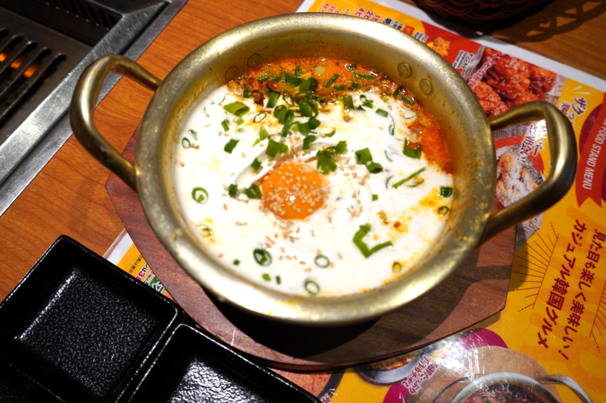 「韓ロゼラーメン」(880円)は、韓国製の即席ラーメンと安楽亭のスープベースを組み合わせたピリ辛ラーメン。上に乗せた生クリームと玉子が、店内製造の牛だしスープと溶け合うことで濃厚な味わいとなる。