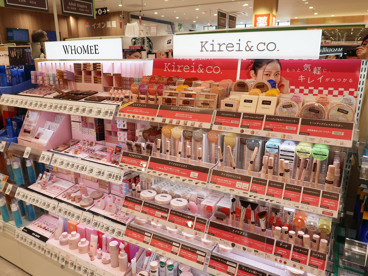 2階は、イオン薬局がオープン。調剤された医薬品の自宅配送も対応する。あえて売り場奥に日用品・頻度品を配置し、2階の売り場正面には、若年層向けにコスメを展開している。「ETUDE」、「TIRTIR」といったアジアンコスメ、プチプラコスメ「キャンメイク」、500円コスメ「Kirei&Co」などがそろう。