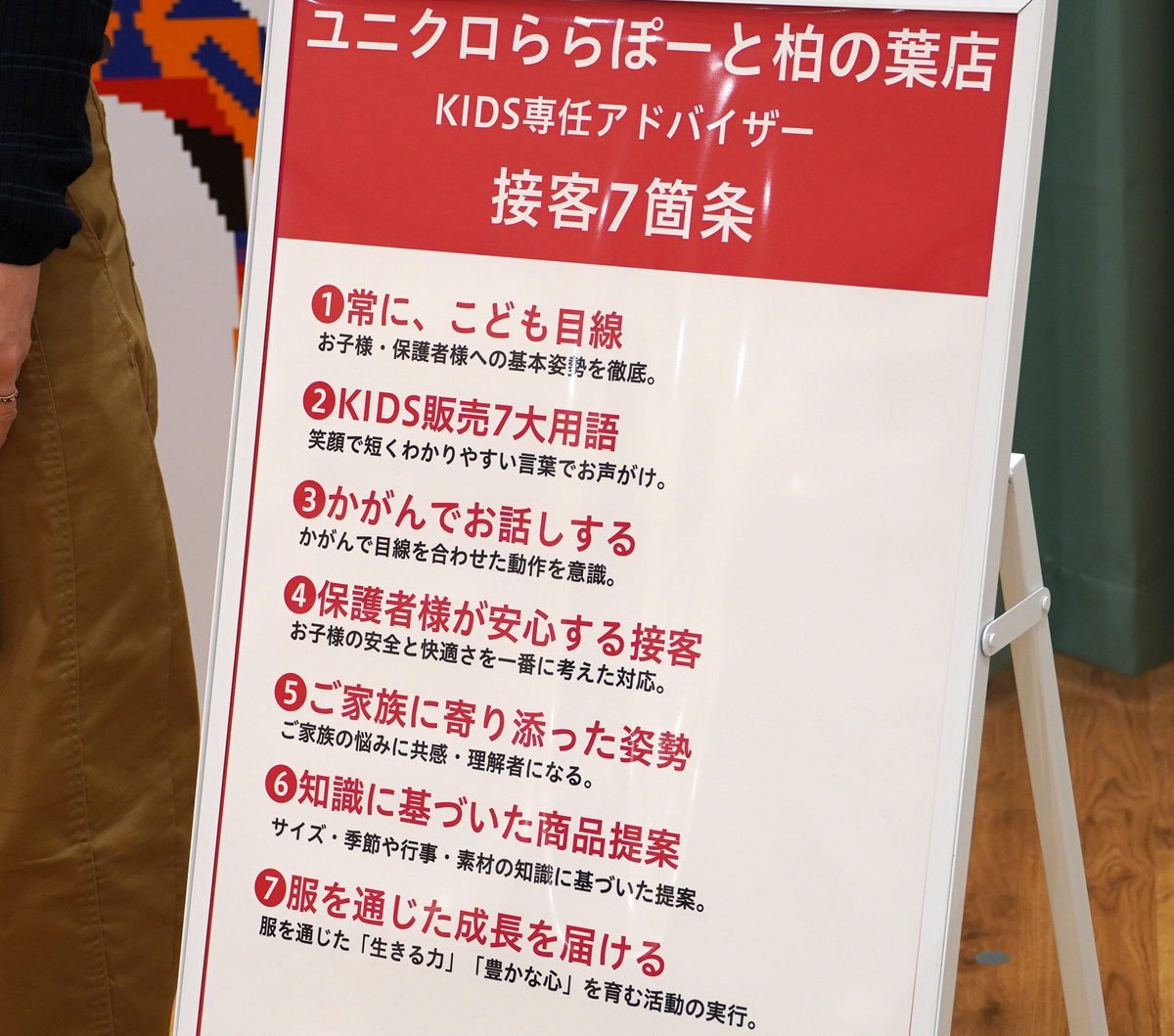 子ども向けのさらなる独自施策として、キッズ選任アドバイザー用の「接客7カ条」も考案。このうち「KIDS販売7大用語」とは、もともとユニクロの通常マニュアルにある「販売7大用語」を子ども向けに設定したもの。短くわかりやすく子どもにも伝わりやすい声かけを行う。