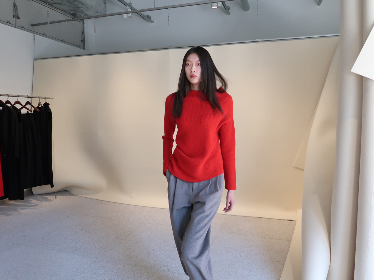 アイコンアイテムは、45度傾けることによってドレープや立体感を出した「KASHIGU(かしぐ) KNIT」(税込み12万1000円、カシミヤ100%)、脇がシームレスになっており、包み込まれるようなラインの「TSUTSUMU PANTS」(9万6800円、ウール100%)。