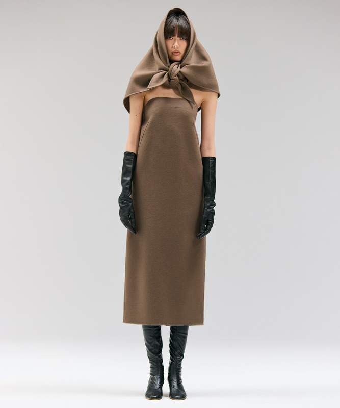 また、ノンミュールジングウール(羊にストレスをかけないウール)と山形県鶴岡市のバイオスタートアップ「Spiber」の糸を掛け合わせたダブルフェース素材のベアショルダーワンピース(19万8000円)が登場。