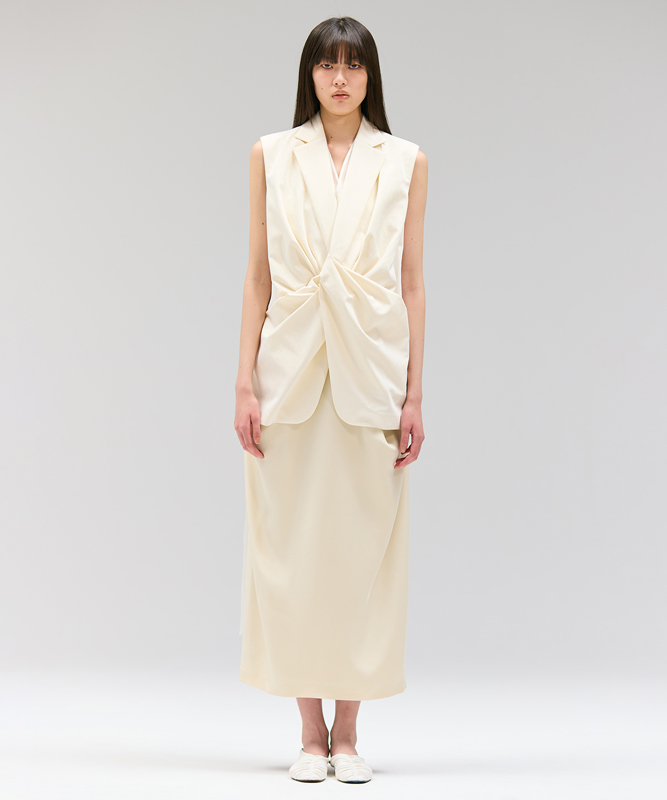 前身で結んだようなドレープタックがポイントのジレ(12万9800円)、 Iラインのスカート(9万200円)は縦糸にシルク、横糸にコットンを使用した。山形県において織った生地を、尾州で染め、新潟県ではニドム加工することで、シルクの光沢と独特の風合い、しっとりしたなめらかさを出した。
