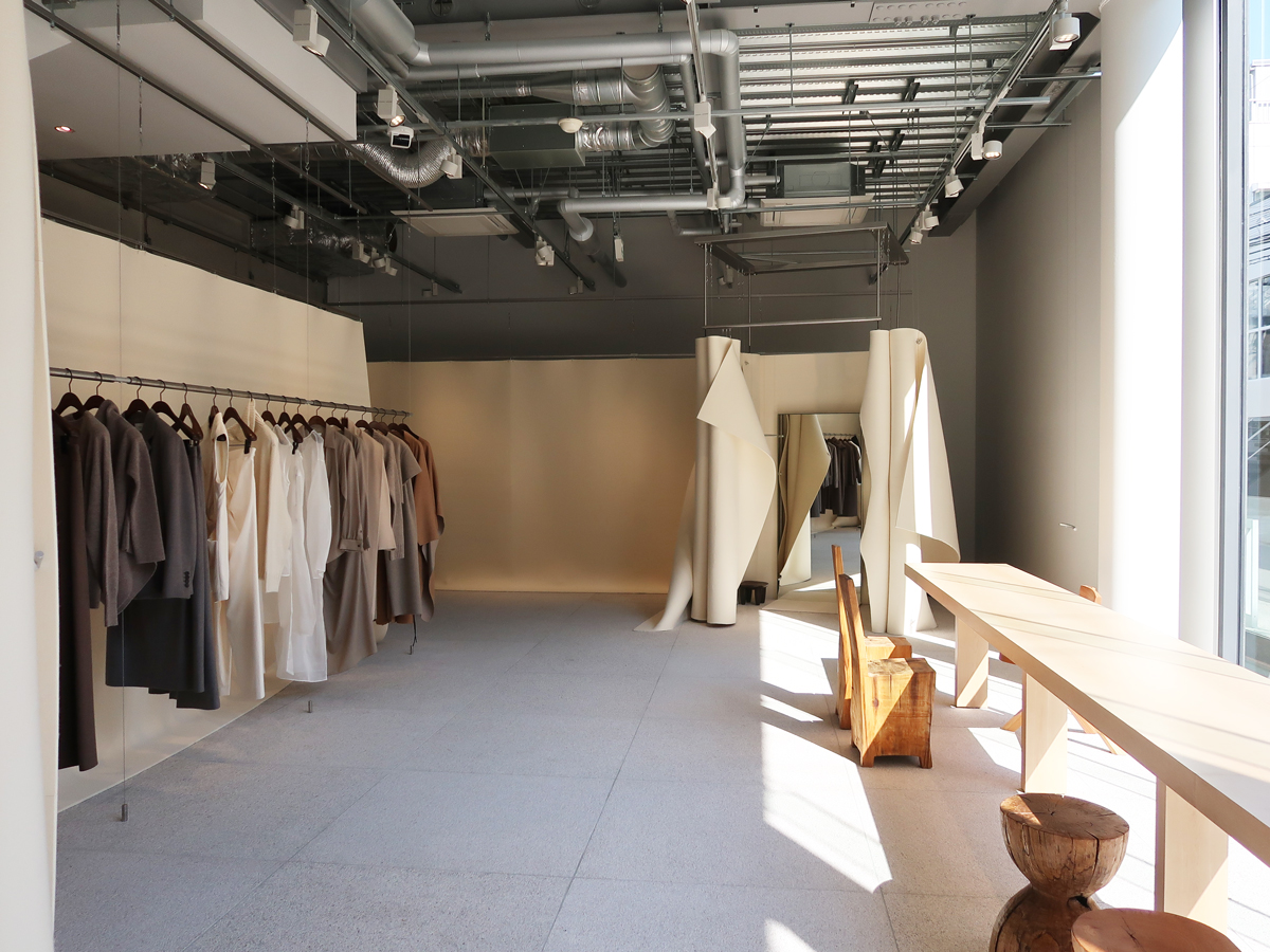 こだわりのフィッティングルームは、石庭のようにランダムな位置で2カ所用意。温かみのあるウール素材が作る美しいドレープの造形からブランドを体感できる。