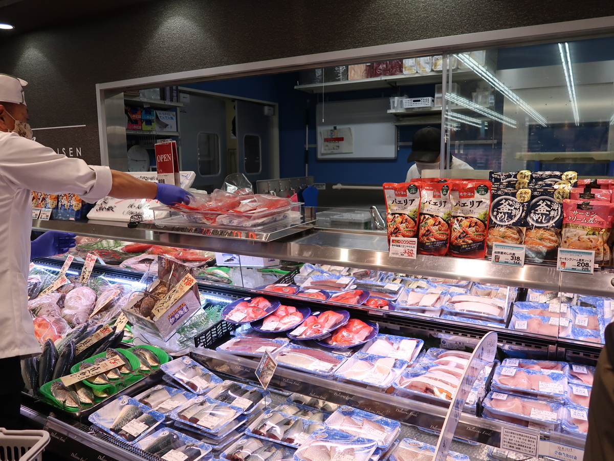 鮮魚は、鮮度の良い生魚を対面売場で販売する。また、刺し身、切り身、冷凍商品も充実させている。