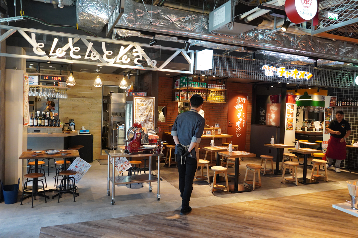全10店舗が入居しており、1階には大型LEDビジョンを取り囲むように、焼き鳥・ピザ・ハンバーガー・まぐろ問屋などバラエティ豊かな飲食店が並ぶ。地元の横浜・神奈川を発祥とする店をはじめとして、オリジナリティあふれるメニューが豊富にそろう。