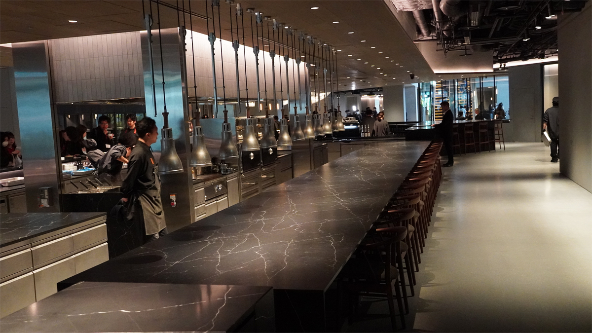 「牛丼 喜喜屋」(※「喜」は正しくは「七」を3つ並べた字)は、全周50m・約60席の大理石バーカウンターを備えた牛丼レストラン。常陸牛や神戸牛など全国のA5ランク和牛を贅沢に使用し、フロア中央の360度のオープンキッチンで職人が目の前で仕上げる。