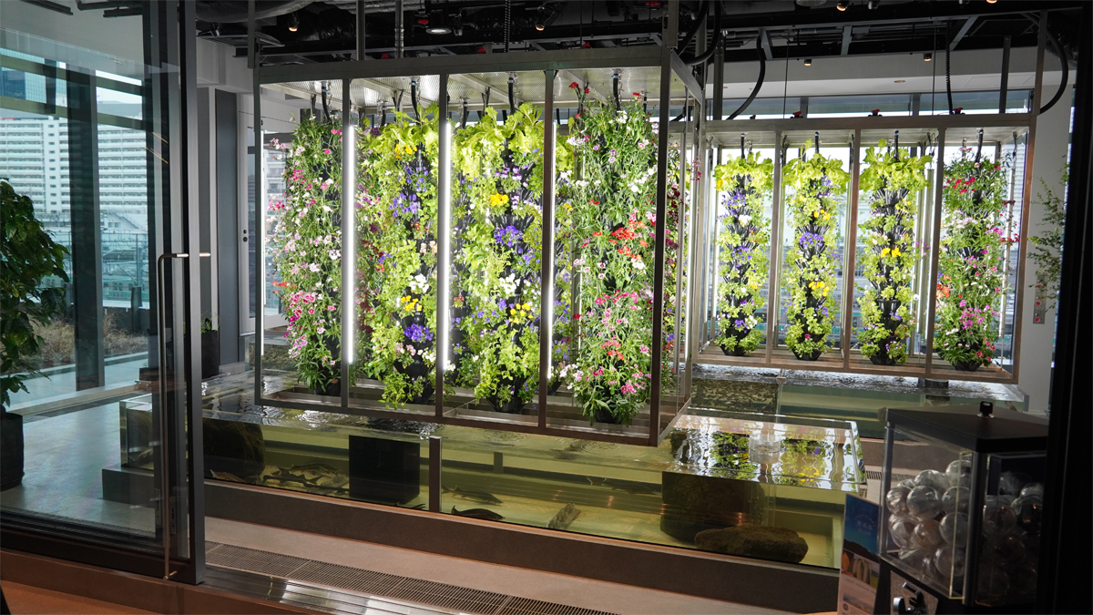 さらに2階部分には、AGRIKOと連携してルミネが自ら運営する都市型アクアポニックスファーム「AGRIKO×MIMURE BOTANICAL Lab(アグリコカケルミムレ ボタニカルラボ)」を設置。全長約6mの水槽と、30本の栽培タワーを備えたオリジナル栽培設備で、エディブルフラワーやハーブ、葉物野菜などを栽培し、日常的に農や食の魅力を体感できる場となる。