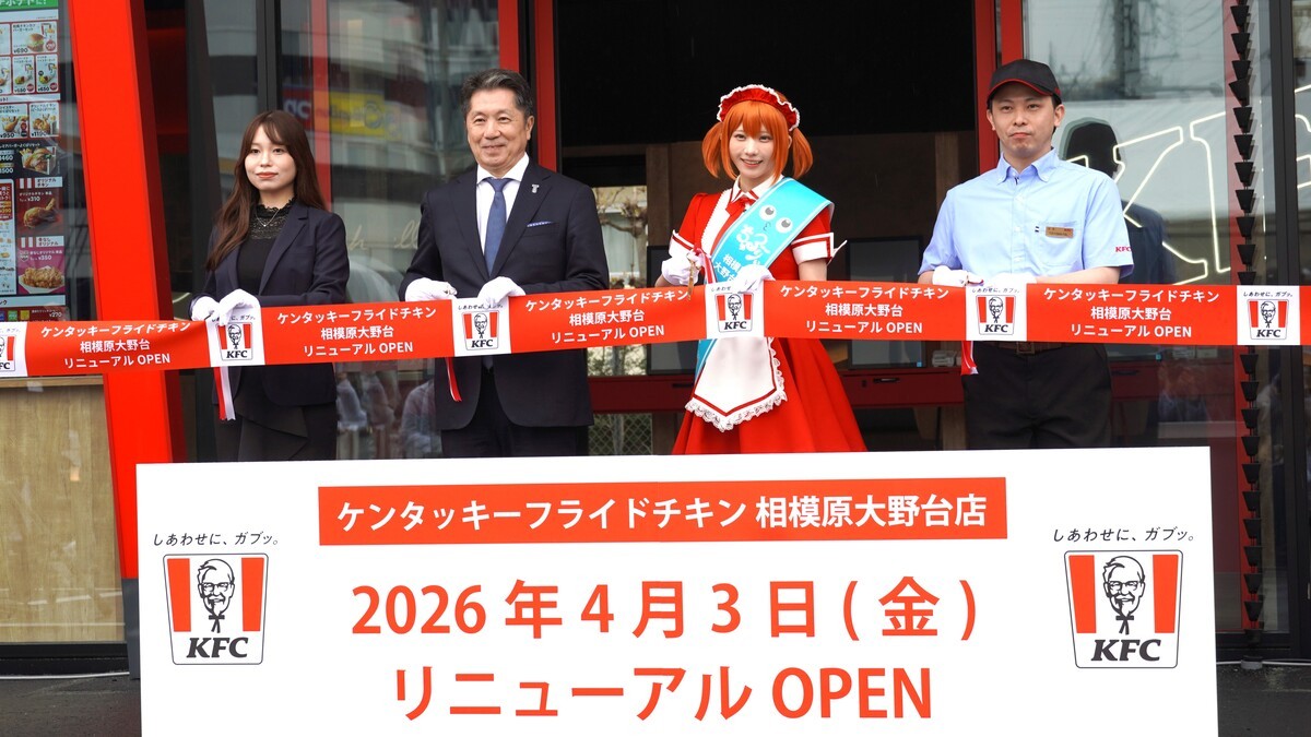 日本ケンタッキー・フライド・チキン(KFC)は4月3日、神奈川県に次世代モデル店舗「ケンタッキーフライドチキン 相模原大野台店」を立ち上げる。既存店を大幅にリニューアルしてオープンする。2日にメディア向け内覧会を開催した。
