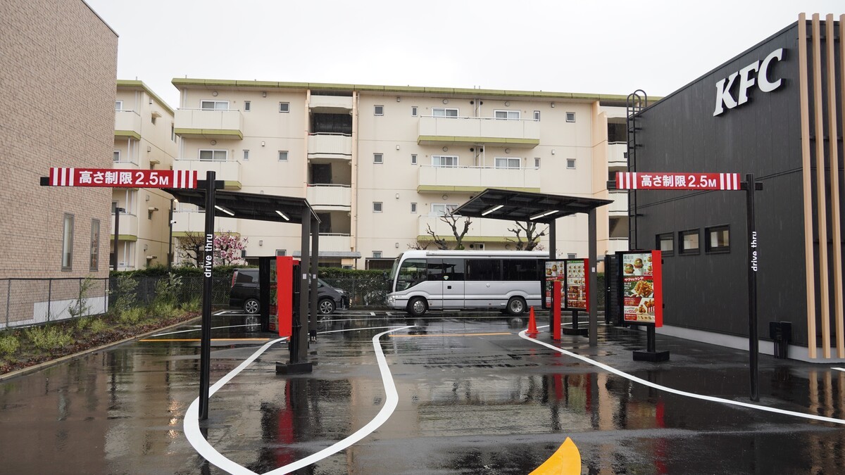 店の外には、国道16号線から入りやすい場所にドライブスルーを設けており、KFCとして初めて2レーンを設置する。1レーンに比べて倍の集客に対応でき、利用する顧客側も待たずに注文ができるというメリットがある。