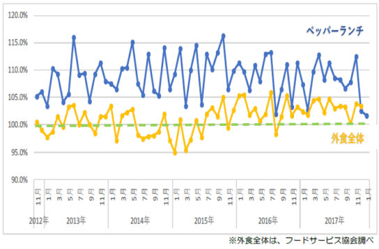 同年9月「ペッパーランチダイナーUENO3153店」を開店し、11月から63か月(5年以上)連続での既存店売上が上昇している(2018年1月末現在)。