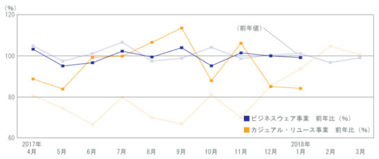 ビジネスウェア事業で、スーツなどが低調に推移した。