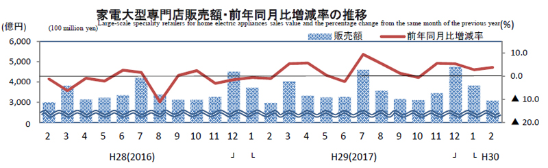 経済産業省が発表した商業動態統計速報によると、2018年2月の家電大型専門店の売上高は3073億円(前年同月比3.8%増)となった。店舗数は2527店(2.5%増)。