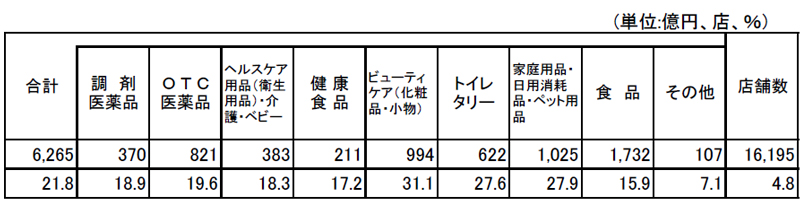 商品別にみると、調剤医薬品370億円(18.9%増)、OTC医薬品821億円(19.6%増)、ヘルスケア用品(衛生用品)・介護・ベビー383億円(18.3%増)、健康食品211億円(17.2%増)だった。