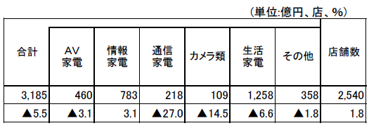 家電大型専門店/11月の売上は5.5%減の3185億円(経産省調べ)