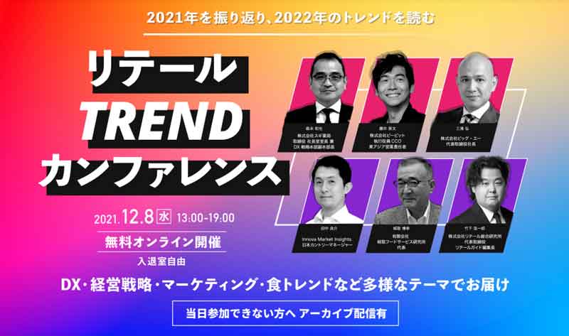 今回のカンファレンスは、小売の「トレンド」に焦点を当て、スギ薬局取締役森永和也氏、ビッグ・エー社長三浦弘氏、「アフターデジタル」著者藤井保文氏らが登壇。2021年の小売業界を総括し、2022年のトレンドを解説するもの。