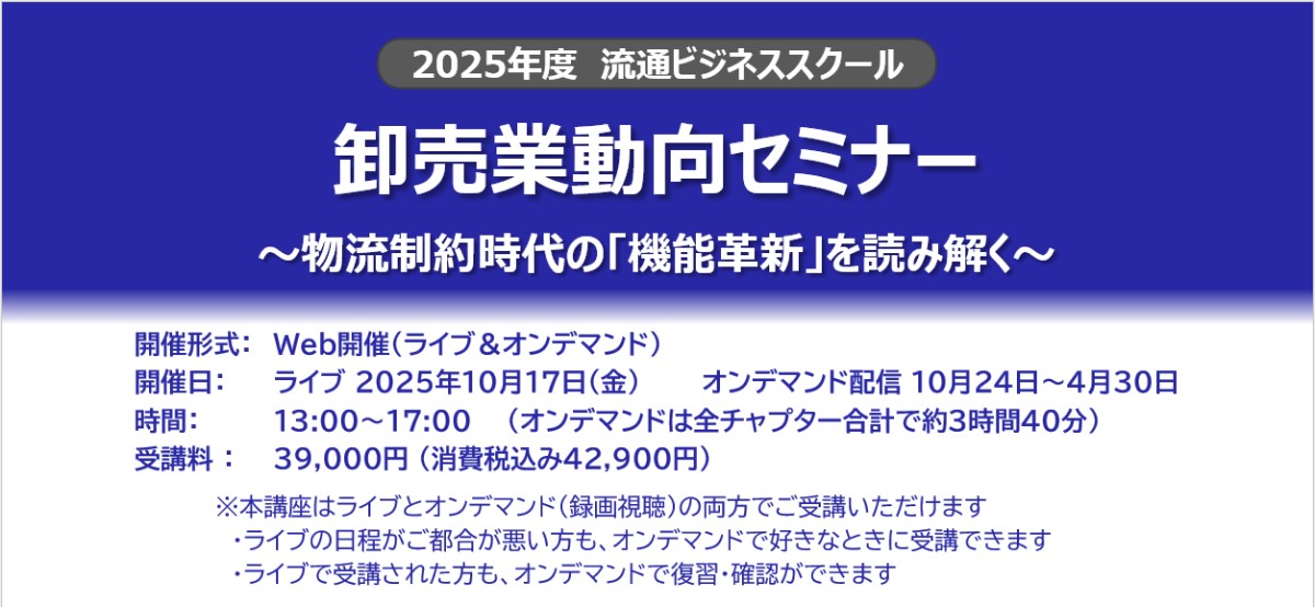 流通経済研究所は10月17日、「卸売業動向講座2025~物流制約時代の「機能革新」を読み解く~」を開催する。10月24日~2026年4月30日には、同講座のオンデマンド配信を実施する。