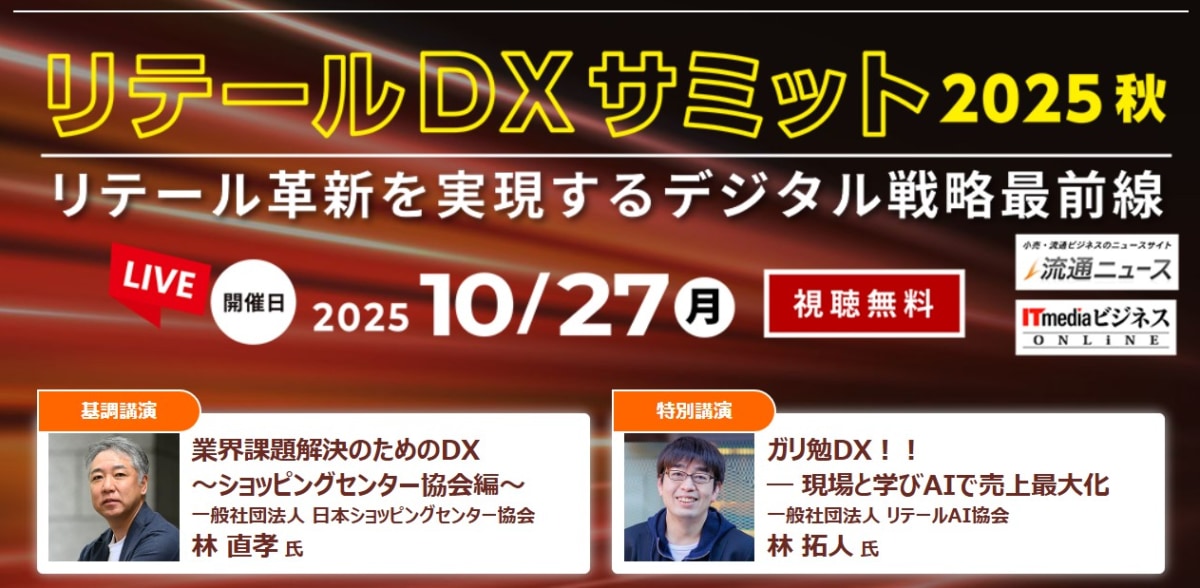 流通ニュース、ITmedia ビジネスオンラインは10月27日、ライブ配信セミナー「リテールDXサミット2025 秋 ~リテール革新を実現するデジタル戦略最前線~」を開催する。