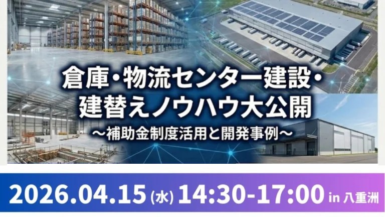 設計や施工といった建設パートナーの選定、導入可能な補助金制度の確認や行政への手続きといった許認可申請などの対応が必要となる。セミナー当日は、総合的な倉庫開発計画の作成イメージを付けられるよう、具体的な開発事例も紹介する。