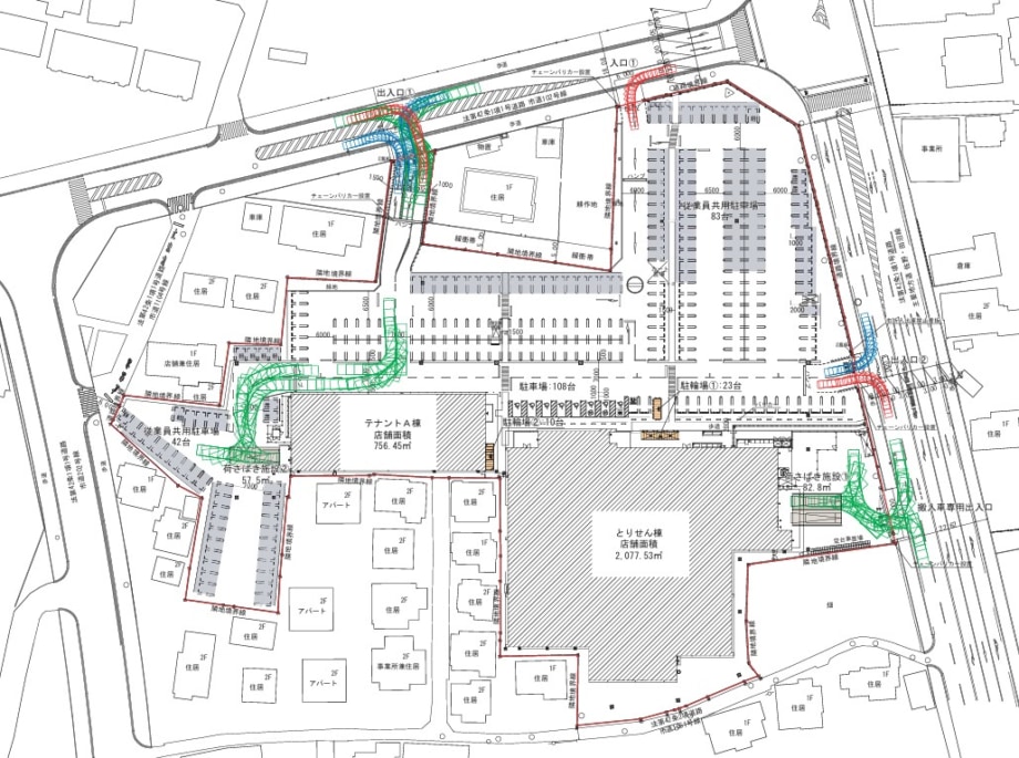 建物は2棟(とりせん棟、テナントA棟)で、各店舗面積は、とりせんが2077.53m2、テナントが756.45m2。