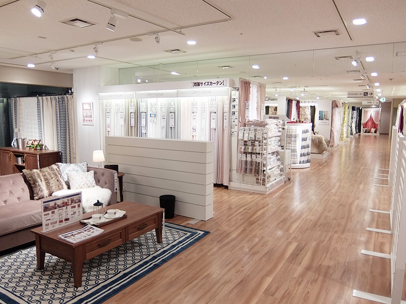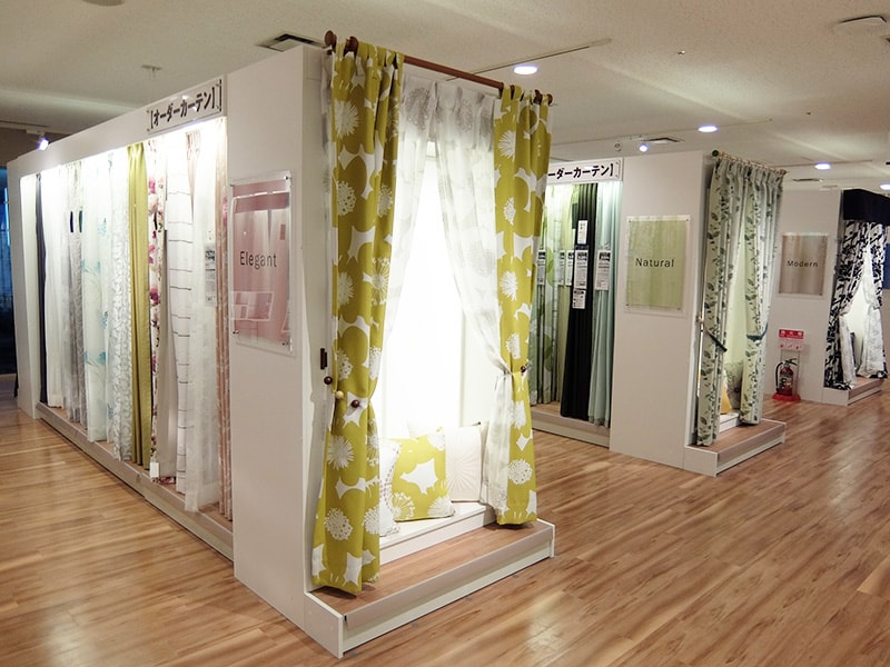 4階は、銀座店で好評のカーテンを展開。銀座店と異なり、スタイル別にカーテンを配置した。カーテンを購入する人は、カーテンと同じ柄のクッションを求める傾向があるため、カーテンと同じ生地を使用したクッションなどの既製品のファブリック製品を配置した。