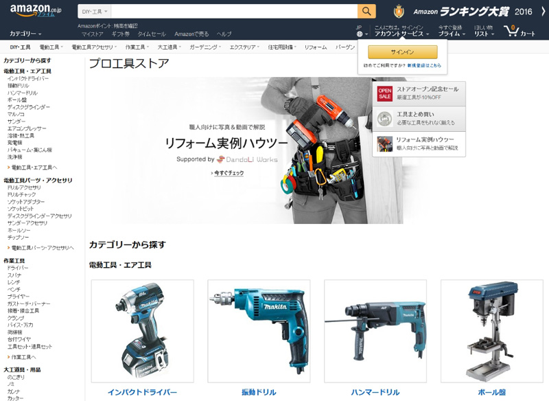 アマゾン/大工や建築関連の職人を対象とした「プロ工具ストア」