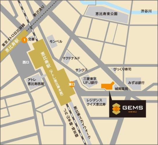 GEMS恵比寿は、JR山手線恵比寿駅徒歩2分、東京メトロ日比谷線恵比寿駅徒歩4分に位置しており、バラエティに富みクオリティの高い飲食店が集積する恵比寿の街に、話題性の高い9店を集積する。