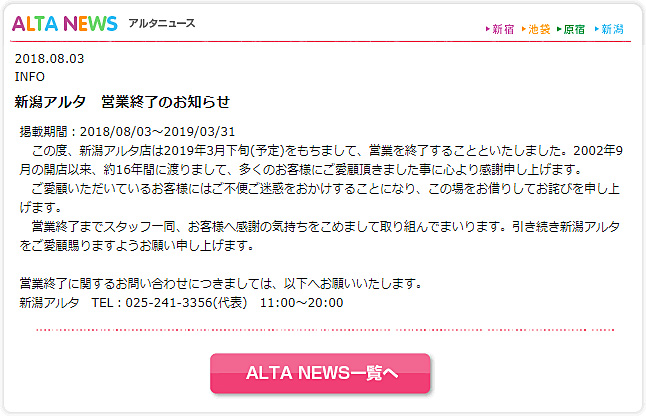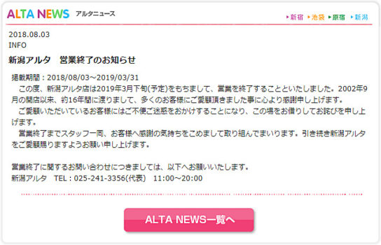 新潟店の閉店により、アルタは、新宿、池袋サンシャインシティ、原宿の3店体制となる。