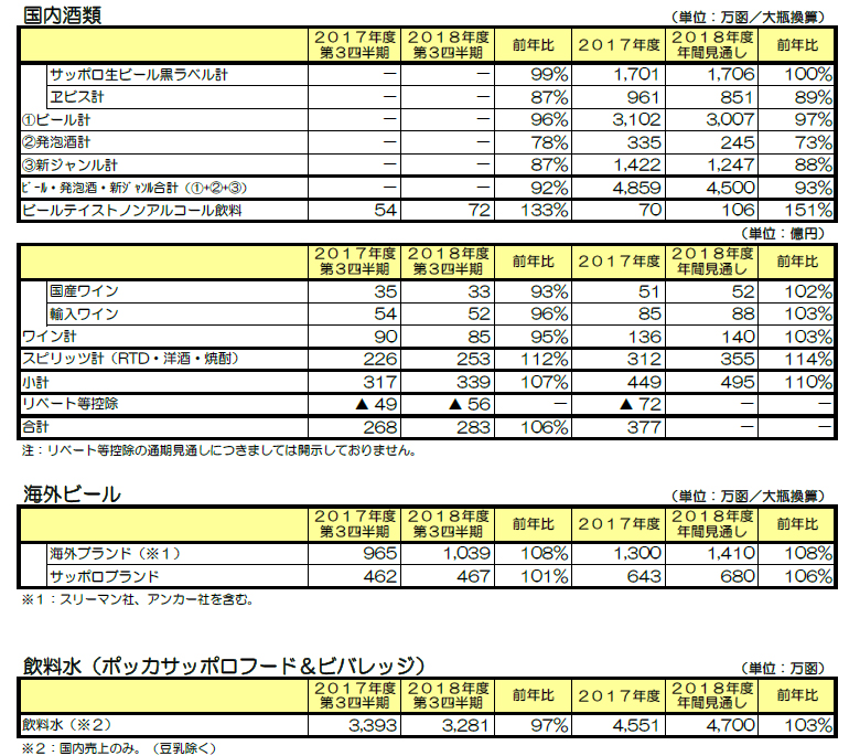 売上収益は、国内酒類事業の「サッポロ 生ビール黒ラベル」の缶製品やRTD、国際事業のスリーマン社が好調に売上を伸ばしたものの、発泡酒・新ジャンルの売上数量が前年同期を下回ったことや、食品・飲料事業における国内の飲料売上がやや低調に推移したことから、減収。