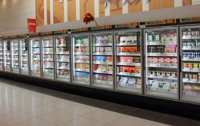 冷凍ケースはガラス扉によって冷気漏れを防ぐクローズ式ショーケースを採用し、電力使用量を削減する。