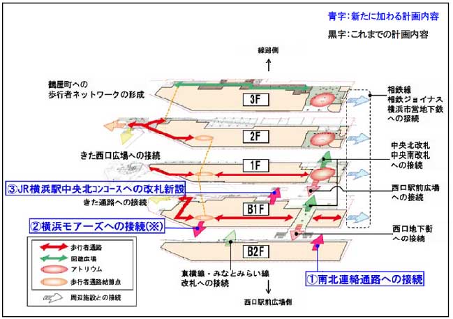 さらに、JR横浜タワーは、これまでの計画に加えて新たに、隣接する3か所(①南北連絡通路(B2F)、②横浜モアーズ(B1F)、③JR横浜駅中央北改札内(B1F、改札新設))と繋がることで、歩行者ネットワークのさらなる充実を図る。