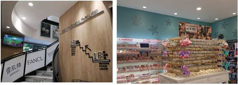 2階には、女性向けの化粧品コーナーに美容食品、サプリメントなど関連商品を配置し、メイクのお試しができるテイスティングカウンターを設置した。
