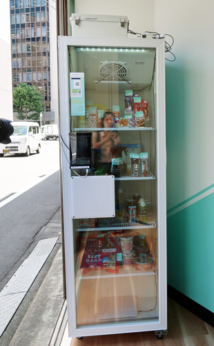 「600」は、常温・冷蔵対応の自販機に約60~100個の商品を内蔵し、クレジットカードによるキャッシュレス販売する仕組みの無人コンビニ。最大月間600個を扱う。