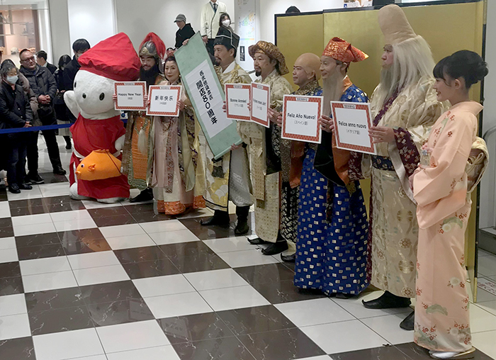 七福神によるご福銭プレゼントでは、写真撮影を希望する客も多く、盛況のうちに終了した。