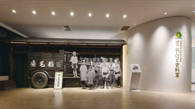 入口には、稲毛屋一号店のファサードとして1930年の稲毛屋魚店を再現した。経営理念「すこやけく」のゾーンでは、経営理念を象徴した「すこやけく像」を展示、二代目社長の猿渡栄一氏のことばなどを紹介する。