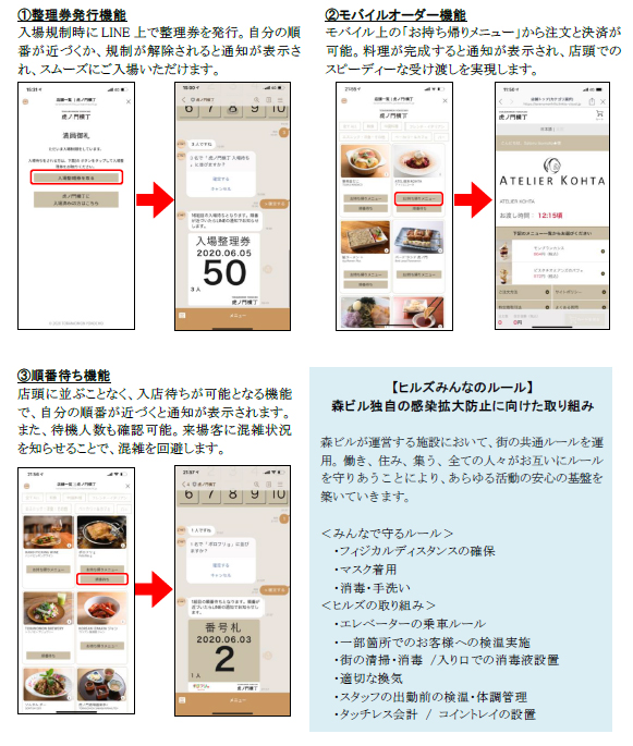 さらに、「虎ノ門横丁」では、コミュニケーションアプリ「LINE」による入場制限時の整理券発行機能、持ち帰りメニューのモバイルオーダー機能、入店の順番待ち機能を活用することで、「虎ノ門横丁」内の混雑回避を図った。